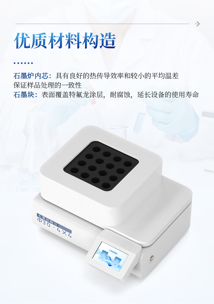 简要描述: 智能石墨消解仪采用优质高纯石墨材质,结合精确的环绕立体加热技术,确保消解孔间温差极小,有效保障了批量样品处理的平行性与结果准确性。智能PID温控系统支持高精度程序升温,用户可灵活设定并存储多组消解程序,操作简便,重现性极佳。同时,仪器具备超温保护、漏电保护等多重安全机制,配合耐腐蚀设计及友好的操作界面,在提升实验效率的同时,全力守护实验安全。