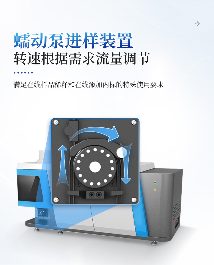 仪器配置了四通道十二滚轴的高精度蠕动泵,可同时保证进样的精度和防止积液,蠕动泵的转速连续可调,满足客户的多种测试要求。