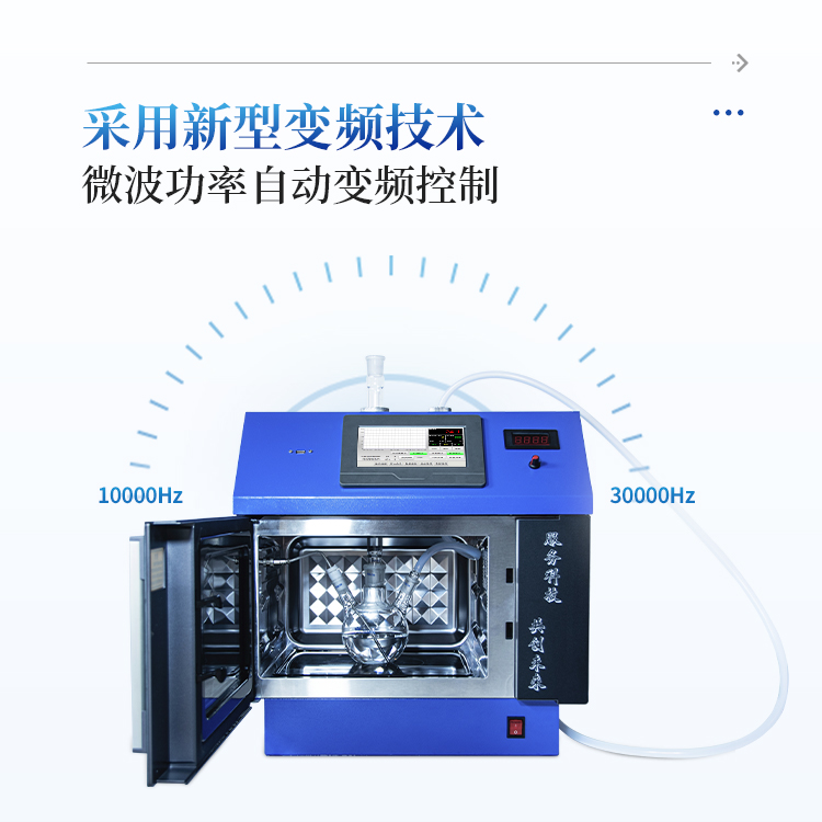 采用最新变频技术,通过变频器将50Hz工频转换为10000——30000Hz可变频率,取代了传统微波反应器使用的高压变压器,完美解决了传统微波反应器精确控温时,高压变压器受尖峰脉冲的冲击,造成变压器频繁损坏的技术缺陷。MCU根据Pt100传感器实时检测到的温度变化数据、反应物质极性、热容变化、反应时间等数学模型的变化条件,自适应PID调节,自动变频控制微波输出功率,从而精确控温。