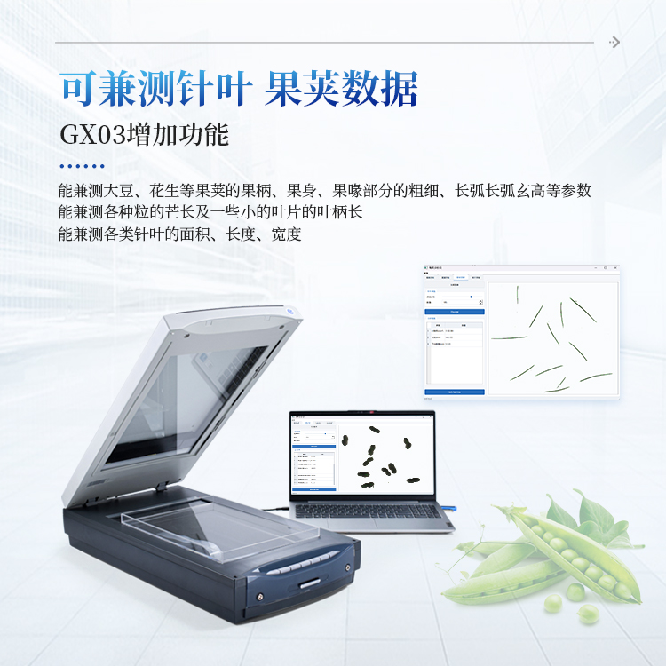 (20)能兼测大豆、花生等果荚的果柄、果身、果喙部分的粗细、长、弧长、弧玄高等参数。