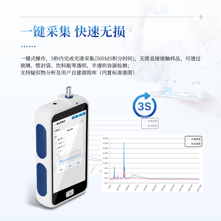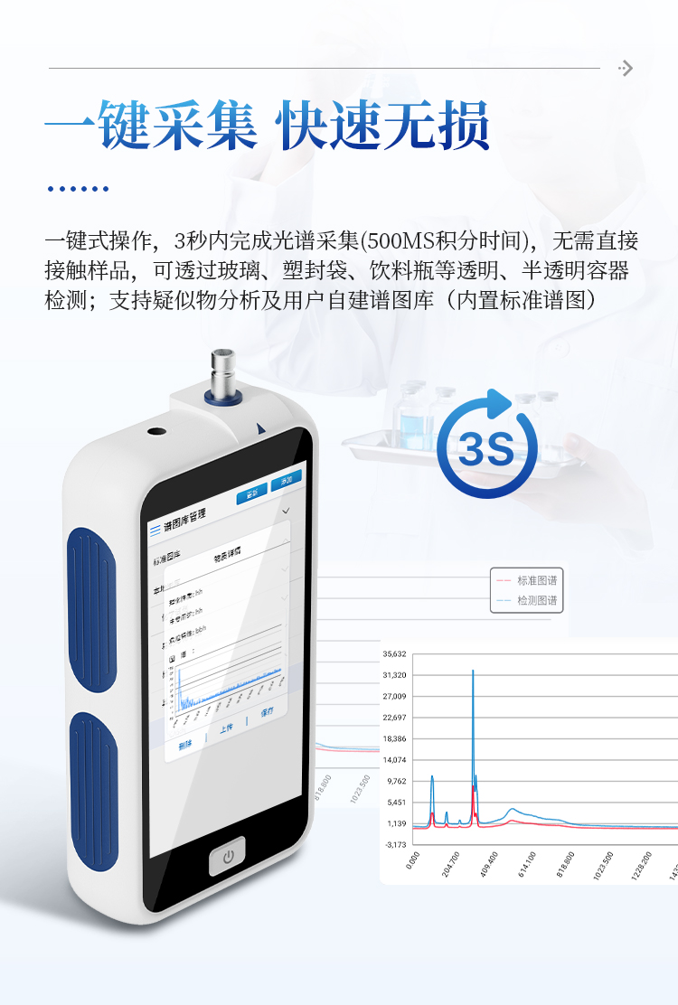 高效检测:一键式操作,3秒内完成光谱采集(500ms积分时间),无需直接接触样品,可透过玻璃、塑封袋、饮料瓶等透明、半透明容器检测;支持疑似物分析及用户自建谱图库(内置标准谱图);