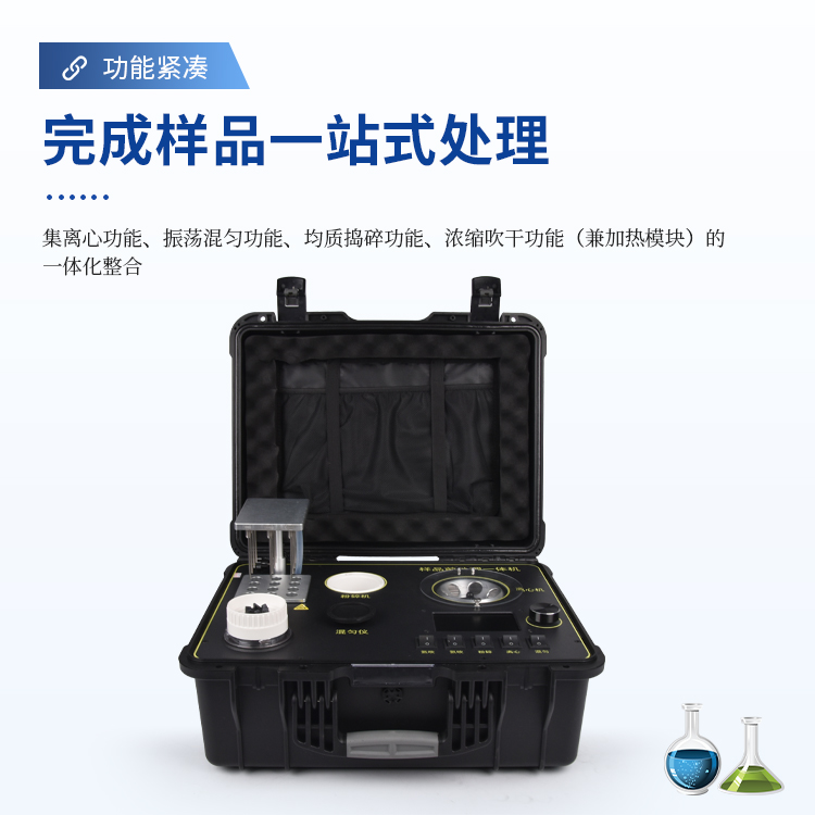 简要描述: 前处理一体机功能紧凑,集成五种样品前处理常用的功能,完成样品一站式处理。结构稳固,机箱采用高品质工程塑料,具备优秀的抗冲击性、耐腐蚀性、便携性。操作稳定,机器采用五寸全彩色液晶屏,功能指示性强,用户操作均为实体开关,杜绝佩戴手套和液体喷溅时的操作失效。