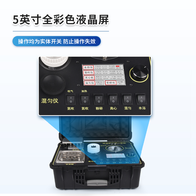 应国内用户的实际需求,自行研制开发的新型仪器——QC05型样品前处理一体机。样品前处理集成箱将样本前处理过程中样品浓缩、水浴恒温、离心分层、均质、振荡混匀等步骤所需设备进行集成,仅需一台样品前处理集成箱设备即可完成所有样本前处理过程,并且方便携带,不仅适用于现场检测使用,还可用于色谱、质谱等分析样品的纯化和制备。