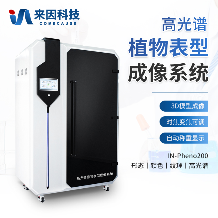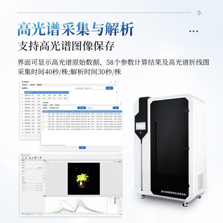 高光谱植物表型成像是主要用于对植物表型进行测量与分析的设备。系统分别在顶部、侧上方以及侧下方设置了可见光成像单元,在侧下方设置了高光谱成像单元,根据底部旋转台设备的转动进而获取植物全方位的表型信息。系统使用了以人工智能为基础的三维成像技术,以多视角结合的方式动态生成植物的三维模型,并且可以根据模型计算植物的株宽、株高、骨架、ASM、SSIM、NDVI等形态、颜色、纹理、高光谱参数。适用于分析禾本科、茄科、十字花科、豆科等植物,主要用于植物生理学、生态学、环境科学、植物保护等领域。