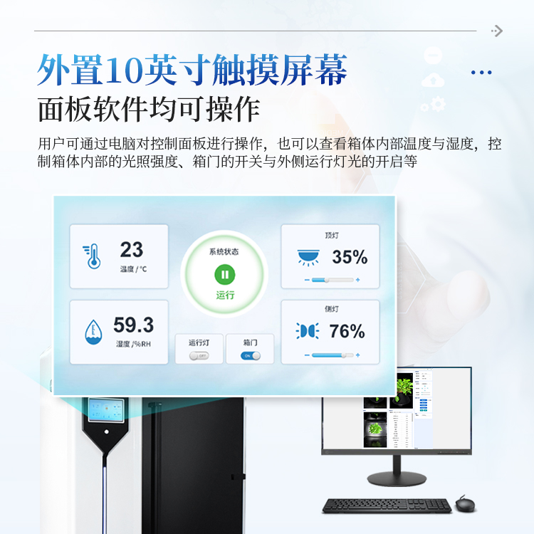 3、仪器控制:外置10寸触摸屏,可以查看箱体内部温度与湿度,控制箱体内部的光照强度、箱门的开关与外侧运行灯光的开启等;也可通过电脑软件控制操作