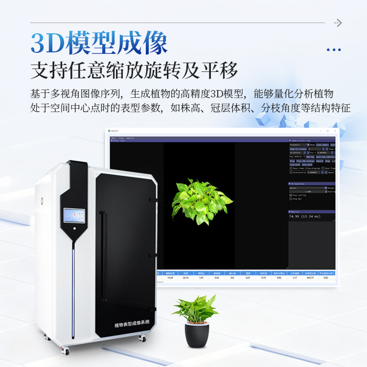 8、3D模型:系统基于多视角图像序列,采用计算机视觉算法动态生成植物的高精度3D模型,该模型支持真三维空间下的任意缩放、旋转及平移操作,能够量化分析植物处于空间中心点时的表型参数,如株高、冠层体积、分枝角度等结构特征,实现了从二维平面观测到三维立体解析的跨越