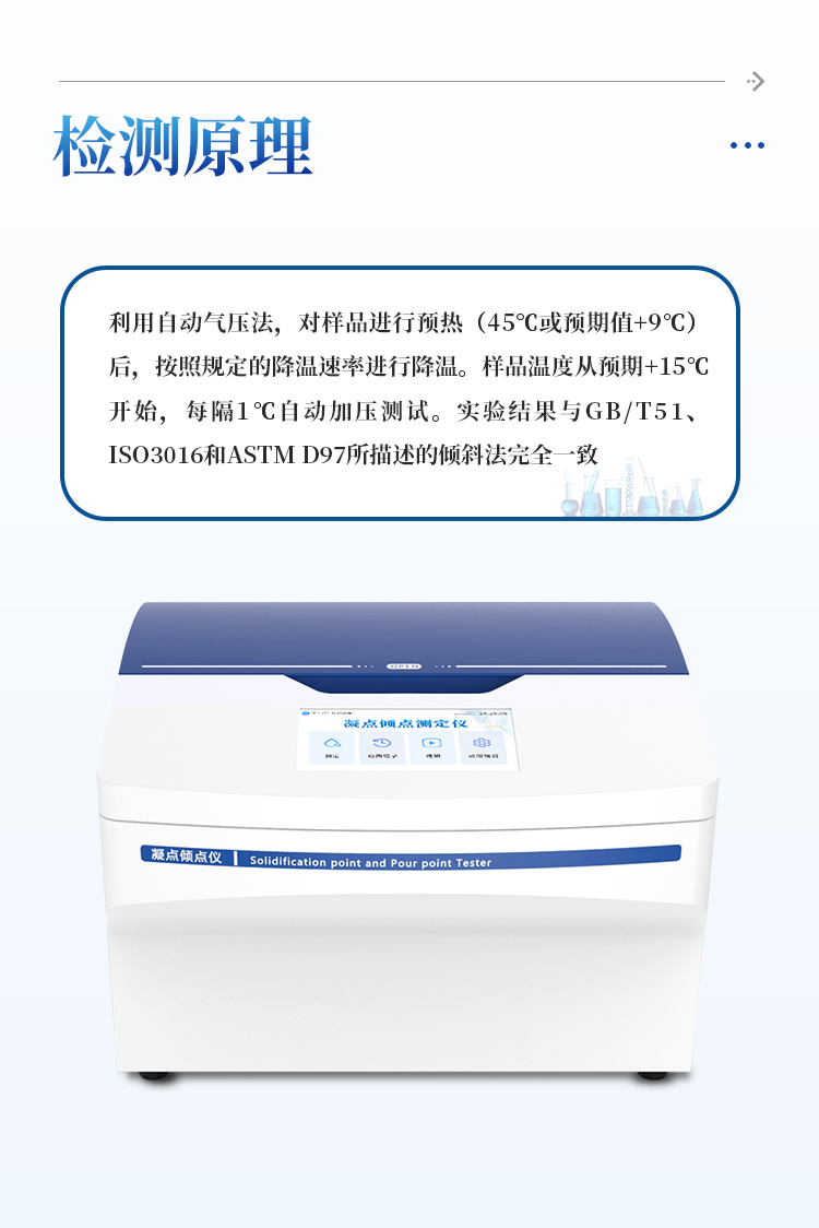 简要描述: 凝点倾点测定仪主要用于石油产品的倾点凝点值测定,是一款集自动化、智能化和高精度于一体的凝点/倾点测定设备。通过创新温控技术与自动气压检测系统,可快速、准确地测定液体样品的凝点和倾点。利用自动气压法,对样品进行预热(45℃或预期值+9℃)后,按照规定的降温速率进行降温。样品温度从预期值+15℃开始,每隔1℃自动加压测试。实验结果与GB/T 510、ISO3016和ASTM D97所描述的倾斜法完全一致。