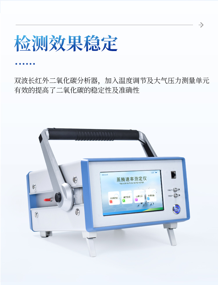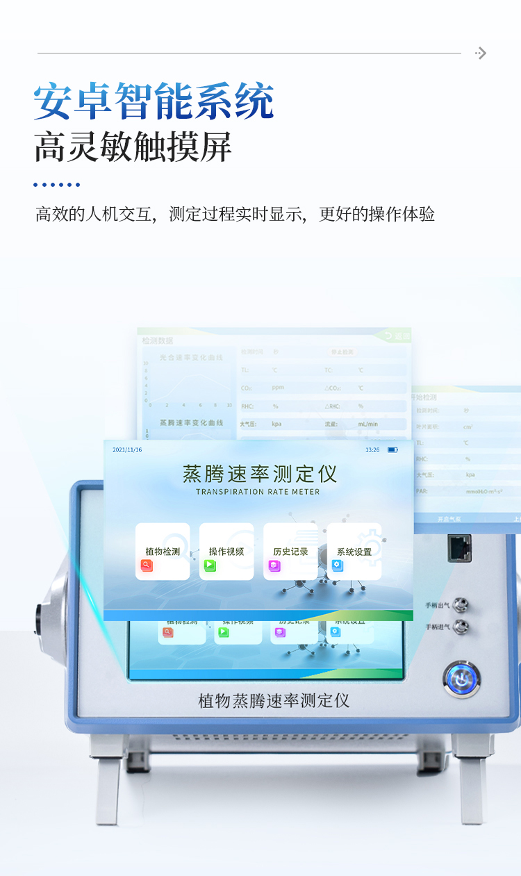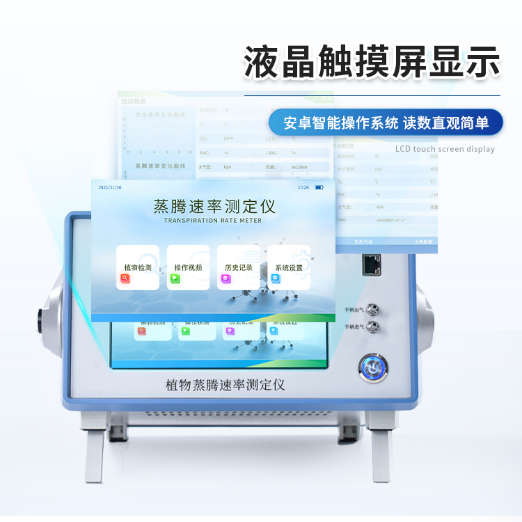 植物蒸腾测定仪是一款检测人工气候室、温室、大棚、大田等植物的活体叶片光合作用的实验仪器,测定内容包括空气CO2浓度、环境温湿度、叶室温湿度、叶面温度、大气压力、光合有效辐射(PAR)、叶片光合速率(Pn)、气孔导度(Gs)、叶片蒸腾速率(Tr)、胞间CO2浓度(Ci)、水分利用率(WUE)、呼吸速率(Rd)、蒸腾比(TR)共15项参数,可用于植物生长生理、光合生理、胁迫生理研究等科学研究,植物光合作用测定仪适用于农业科研、教学、园艺、草业、林业以及更广泛的领域。