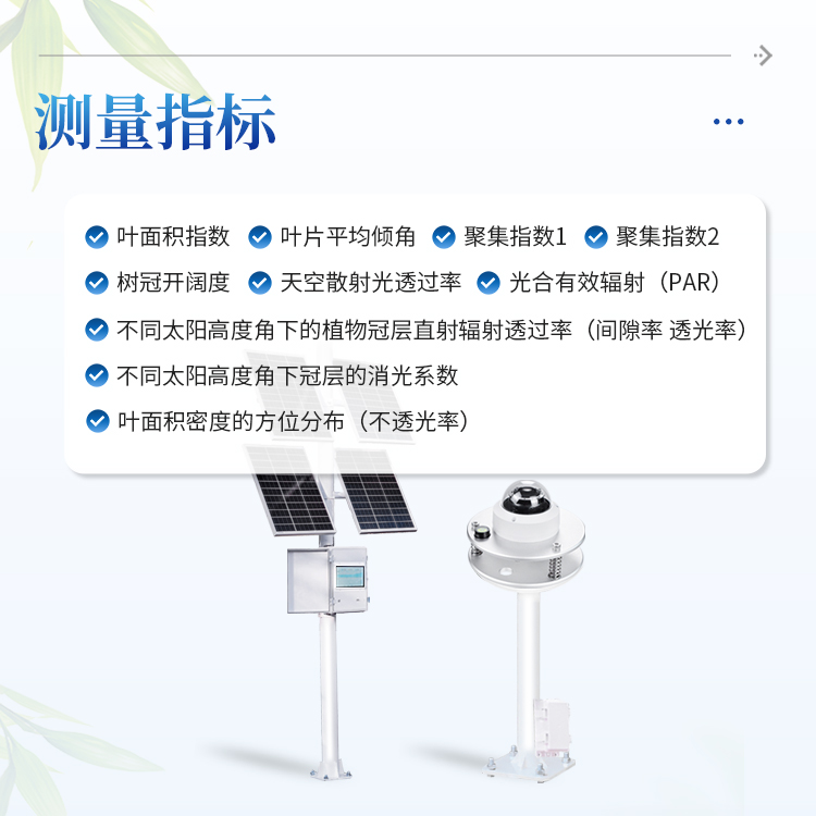 太阳能供电系统、冠层分析主机、可移动式图像采集器(含150°鱼眼镜头)、传输模块、安装支架、数据云平台