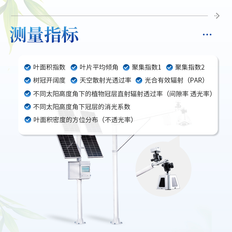 太阳能供电系统、冠层分析主机、可移动式图像采集器(含100°镜头)、传输模块、安装支架、数据云平台